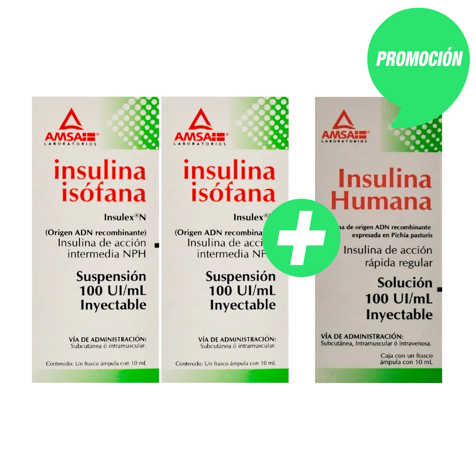 Promoción un frasco de insulina rápida regular, marca AMSA, 10 mL, 100 UI / mL + 2 frasco de insulina ISOFANA de acción intermedia, marca AMSA, 10 mL, 100 UI / ml, Solución inyectable .