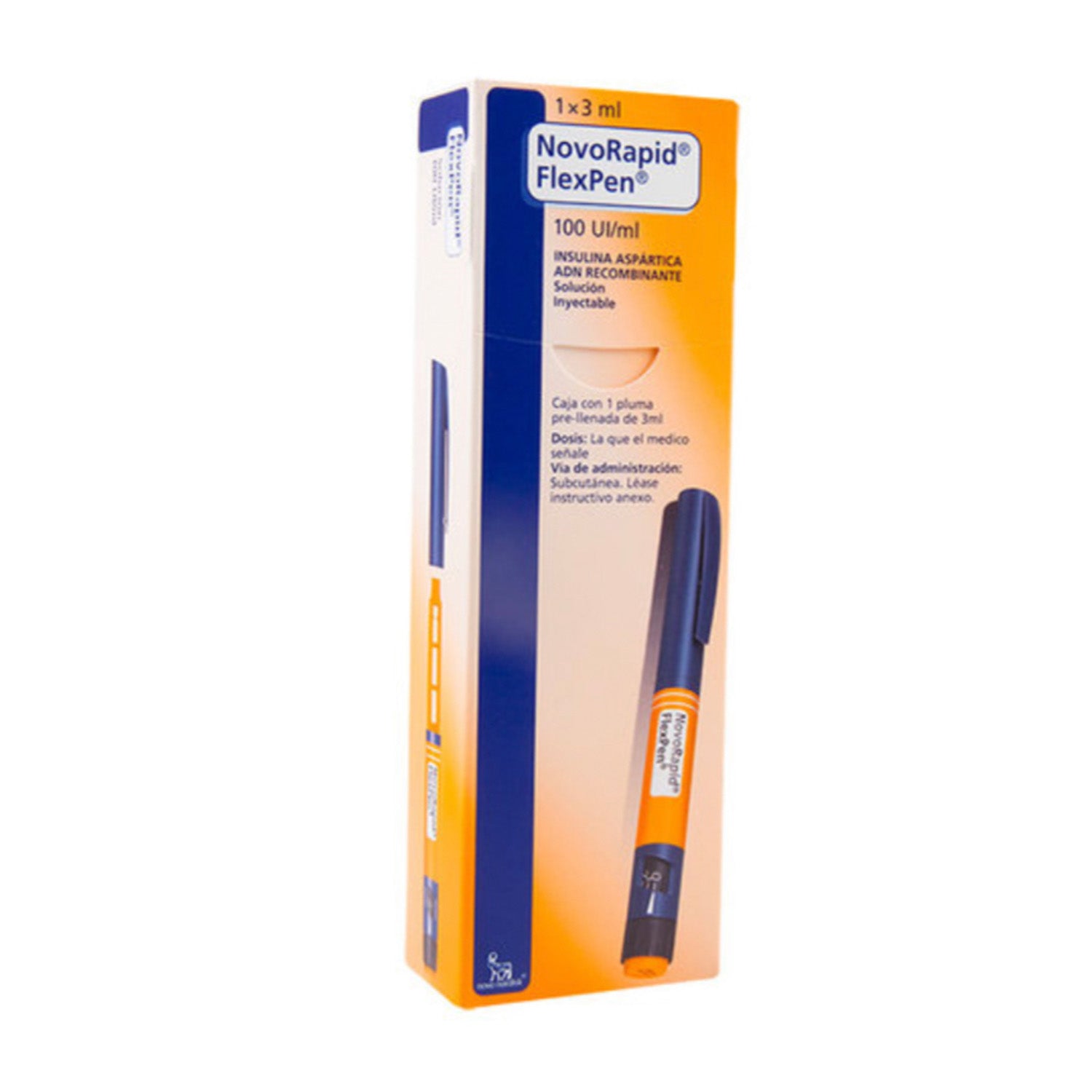 Caja con 1 pluma prellenada de 3 mL FlexPen®, insulina aspártica, marca NovoRapid®, 1 x 3 ml, 100 UI / ml