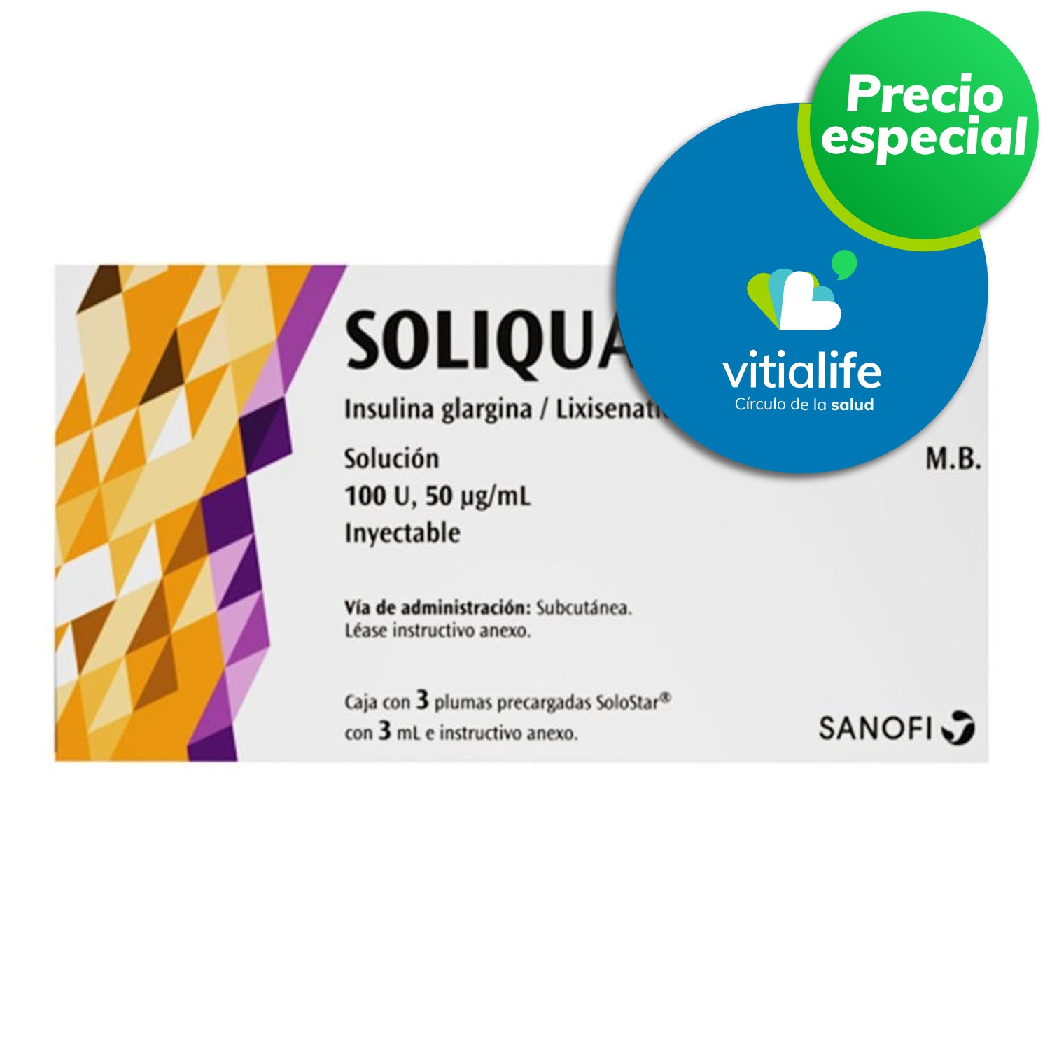 Productos: Insulina glargina / Lixisenatida, marca Soliqua®, 100 U, 50 μg/mL, 3 plumas  precargada con 3 mL
