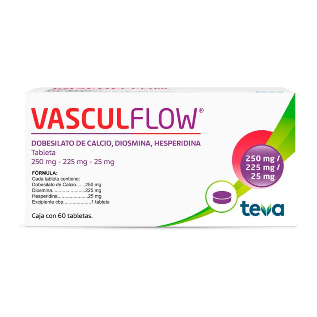 Vasculflow 250/225/25 mg, oral, caja 60 tabletas. Dobesilato de Calcio, Diosmina, Hesperidina.